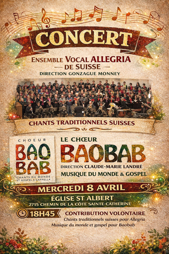 Le mercredi 8 avril à partir de 18h45, nous seront en concert à l’église Saint-Albert-le-Grand. Pour l’occasion, nous serons accompagnés de l’Ensemble Vocal ALLEGRIA, tout droit venu de Suisse pour l’occasion!
